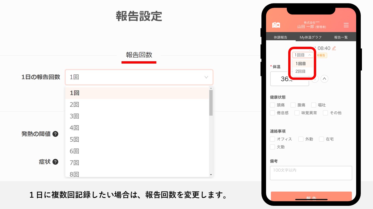 ①1日の報告回数を選択します。(1回から25回まで選択可能)