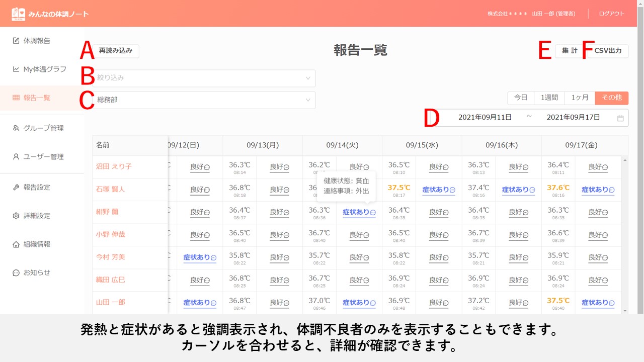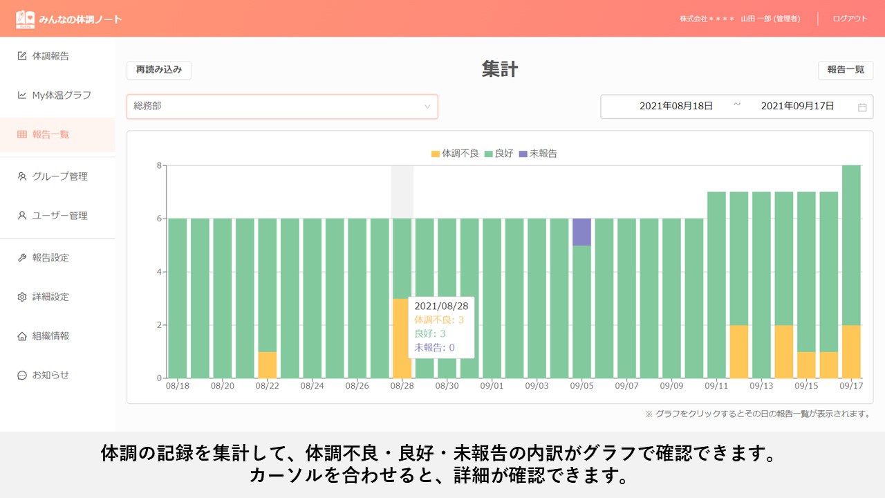 E 日々の体調報告を「体調不良(黄)」「良好(緑)」「未報告(青)」に分類し、グラフで表示します。