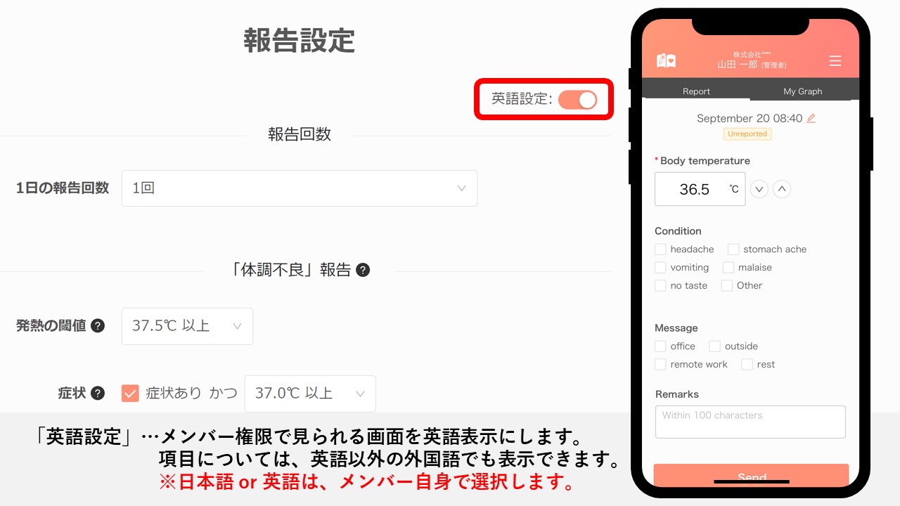 メニュー>報告設定>英語設定
