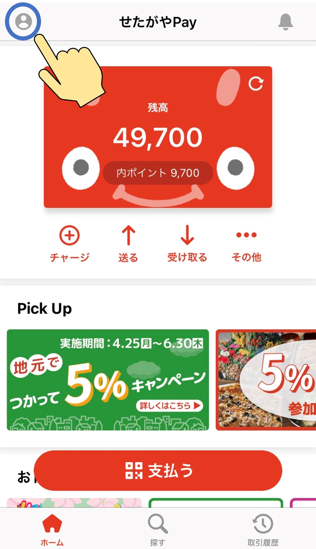1.アプリトップの左上の人型のアイコンをタップして、マイページを開く