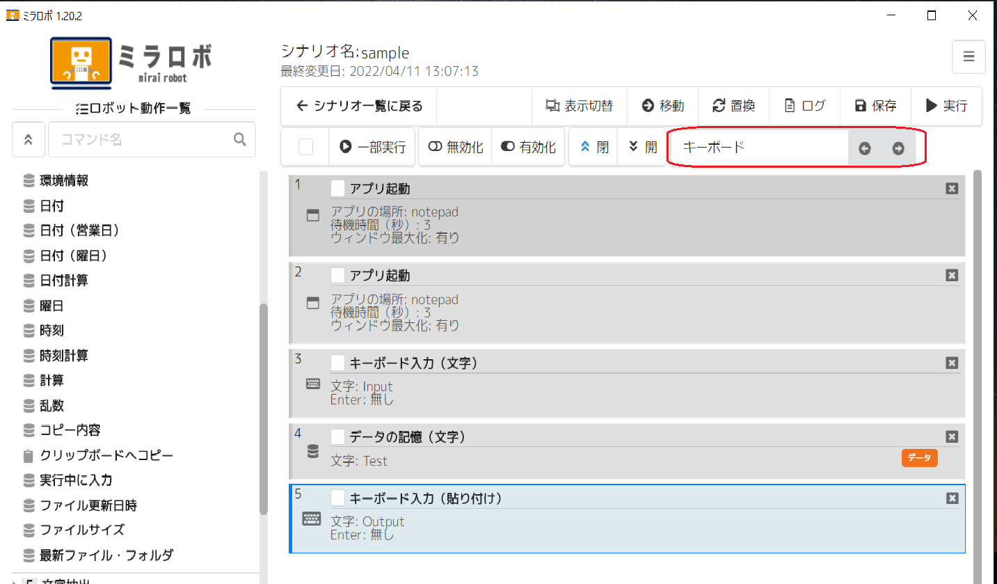 検索に一致したコマンドは、枠左側が水色に変化する。(下図)
