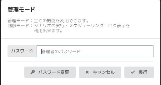 - 制限モード:シナリオの実行・スケジューリング・ログ表示のみ実行可能