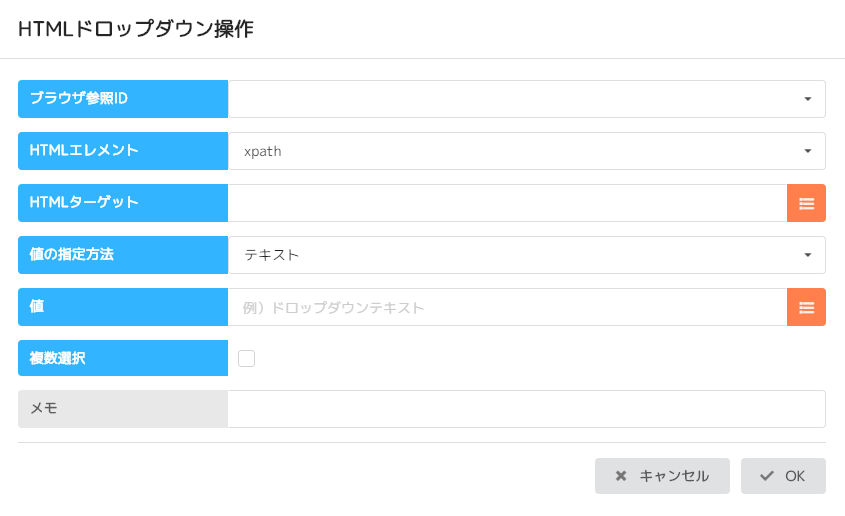 - 値 :選択するドロップダウンの値(テキスト、value属性、何番目)を入力する