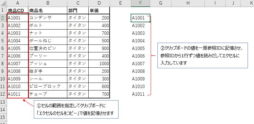 複数行のセル値をまとめてクリップボードに記憶したあと、1行ずつ読み出して他に活用することを想定したシナリオです。