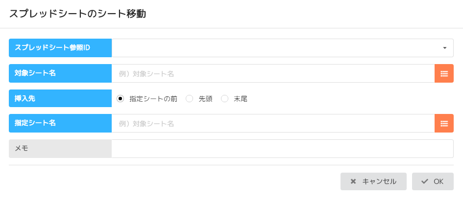 6.11.8. シート > 移動 スプレッドシートのシートを移動する。 名称 :内容 スプレッドシート参照ID: 定義したスプレッドシート参照IDを指定する 対象シート名: 移動するシート名を指定する 挿入先: シートの移動先を選択する 指定シート名: 挿入先「指定シートの前」のときに表示される 挿入先のシート名を入力する Facebook SHARE Twitter SHARE LINE 送る Hatena BOOKMARK