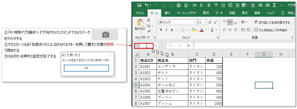 アプリのメニュー領域などを選択する際に便利な、「M 特殊アプリ操作>クリック>アプリをクリック」を使用してエクセルで現在選択されているセル番号を取得することを想定したシナリオです。