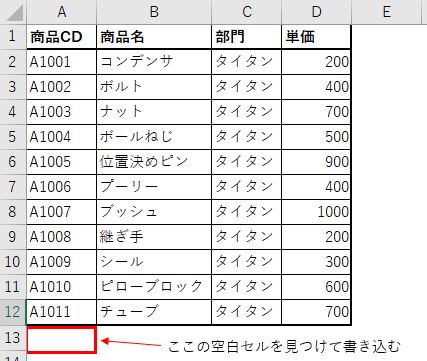関数を使わず、ショートカットキーで縦方向にある空白セルを見つけて値を書き込むことを想定したシナリオです。