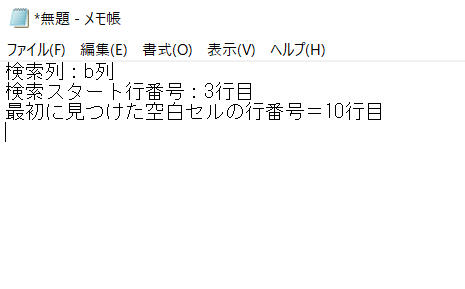 シナリオ事例では、「テスト結果集計エクセル」上で、B列を指定し、検索スタートセルを3行目とし、そこから行方向に、空白セルが出現するまで検索し、最初にでてきた空白セルの行番号を、メモ帳に記入しています。