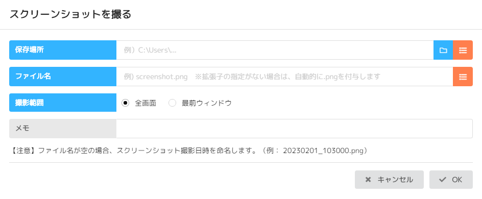 6.1.8.画面 > スクリーンショットを撮る 指定した撮影範囲のスクリーンショットを撮るコマンド。 名称 :内容 保存場所: スクリーンショットの保存場所を指定する ファイル名: スクリーンショットのファイル名を指定する 撮影範囲 :撮影範囲を選択する Facebook SHARE Twitter SHARE LINE 送る Hatena BOOKMARK