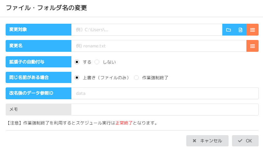 - 改名後の データ参照ID 入力有り:名前変更後のファイルパスを記憶するデータ参照IDを定義する 入力無し:データ参照IDを定義しない