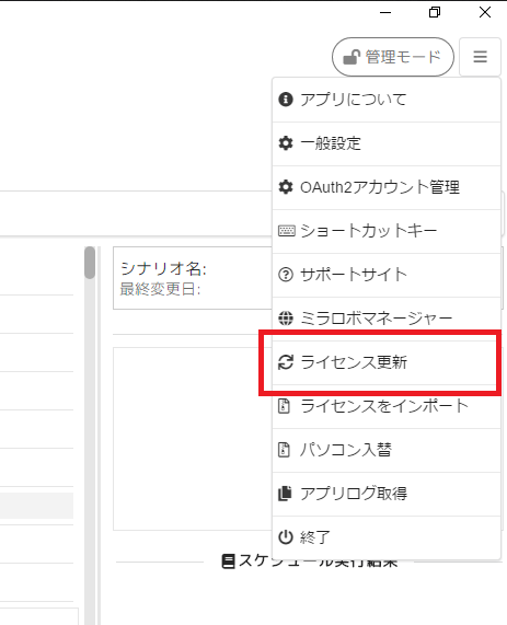 製品版に申し込んだがトライアルの残り日数表示が消えない 製品版開始日以降であれば、シナリオ一覧にあるメニューから「ライセンス更新」をクリックすると残り日数表示が消えます。 Facebook SHARE Twitter SHARE LINE 送る Hatena BOOKMARK