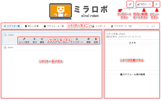 ライセンス認証後にミラロボを起動するとシナリオ一覧画面(下図)が表示される。