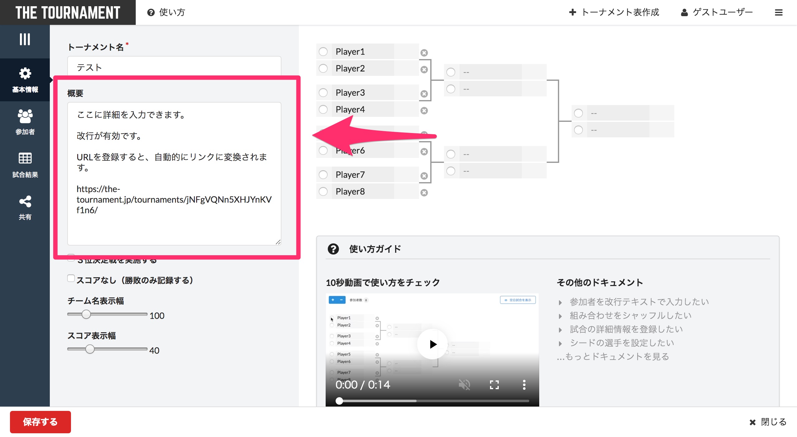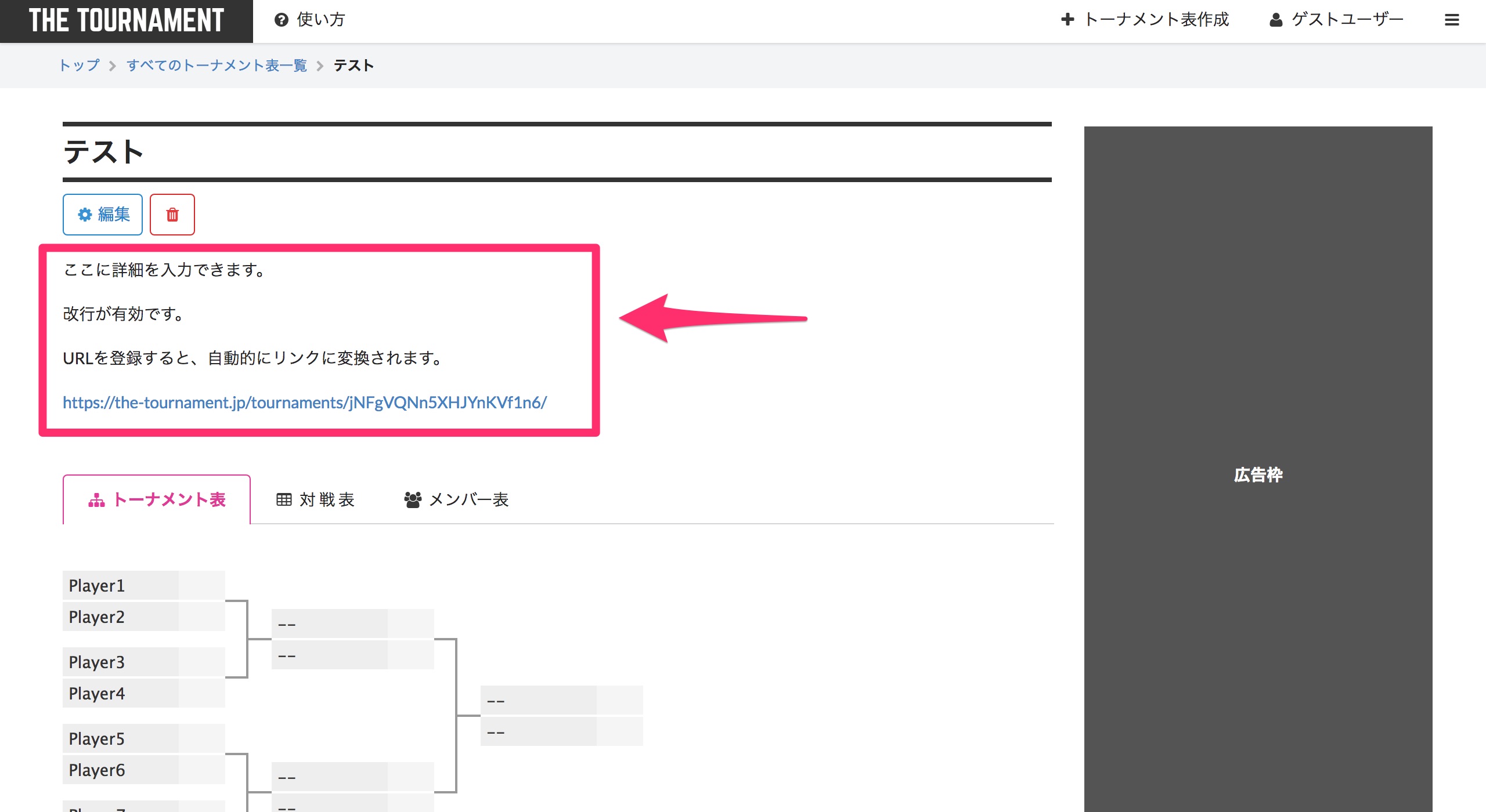 入力したテキストは、公開URL(トーナメント表詳細ページ)でタイトルの下に表示されます。