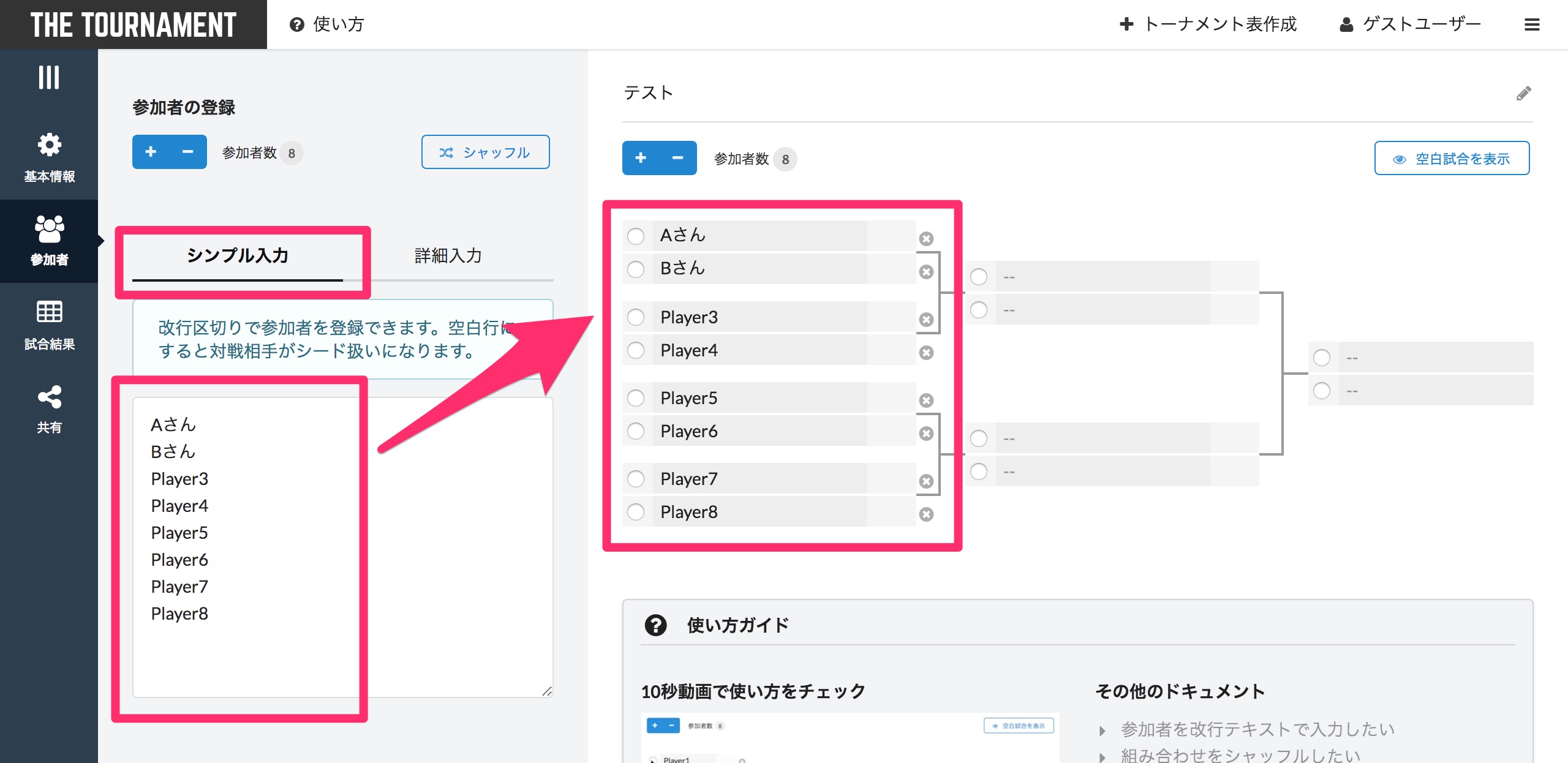 シードを設定したい場合、空白行を挟むと対戦相手がシード扱いになります。