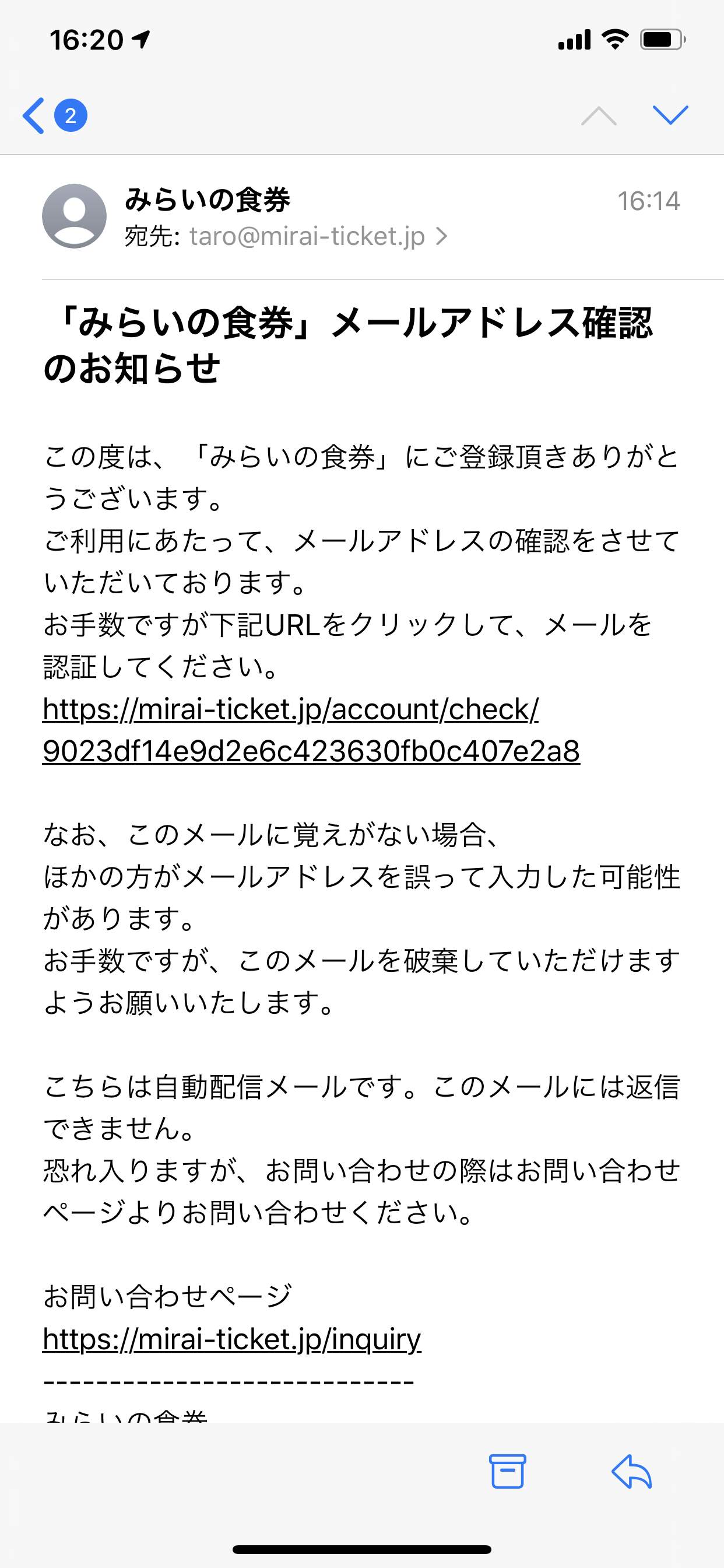 ③「みらいの食券」から「みらいの食券メールアドレス確認のお知らせ」というメールが届いていますので、文中にあるURLをクリックしてメールを認証してください。サイトに移動すると会員登録・ログインが完了しています。