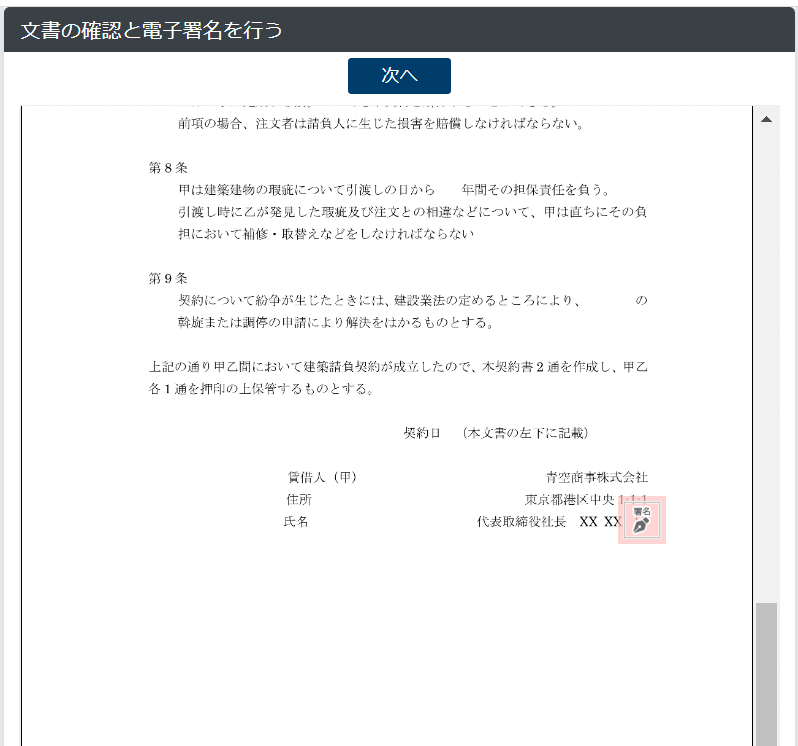 - 署名者を上司や権限者などに変更する場合は、「署名者を変更する」を選択し、姓名やメールアドレスを入力します。