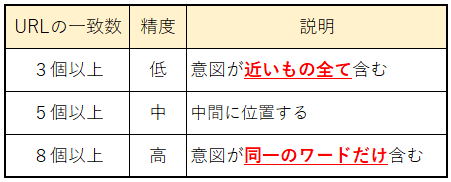 検索結果に表示されるURLが一致する数で判別しています。 1位~10位のURLの内、3個以上一致する場合、精度を「低」としています。意図は近いが、必ずしも同一ではないものも含まれます。
