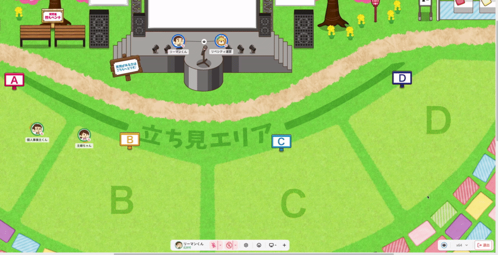 参加者は、スペースのどこにいても話を聞くことや画面共有された資料を見ることができます。