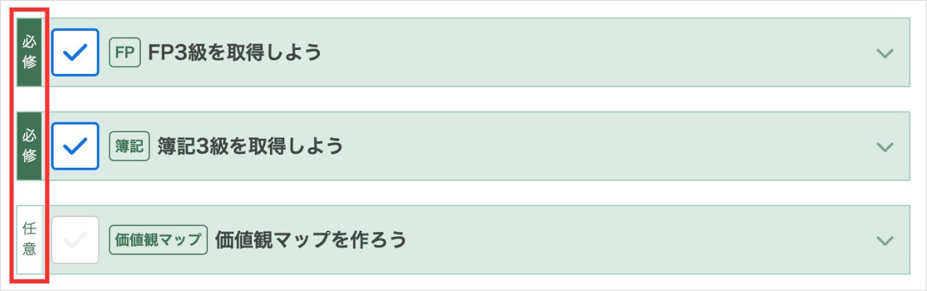 経済的自由をつくる宿題リストの項目には、「必修」のものと「任意」のものがあり、それぞれラベルをつけています。
