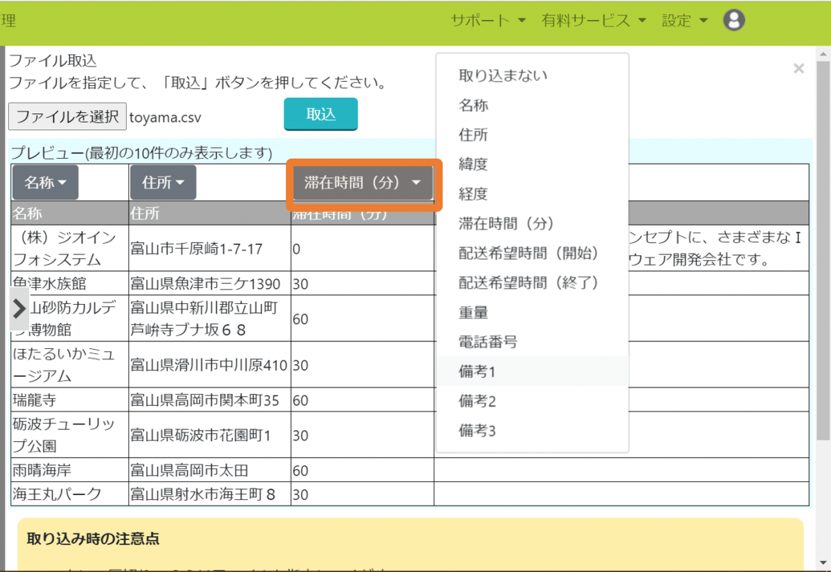『住所』もしくは『緯度』と『経度』は必須項目です。