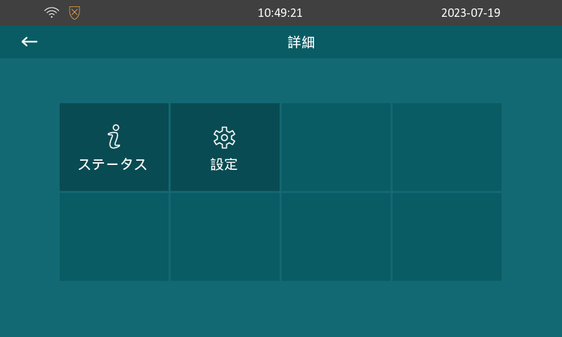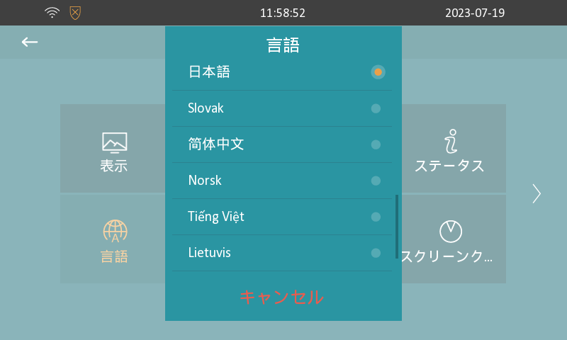 室内モニターの言語変更 【詳細】→【設定】をタッチします。 詳細→設定.bmp 【言語】をタッチし、使用する言語をタッチして選択します。 言語.bmp 言語選択.bmp 公開日時 : 2020/06/16