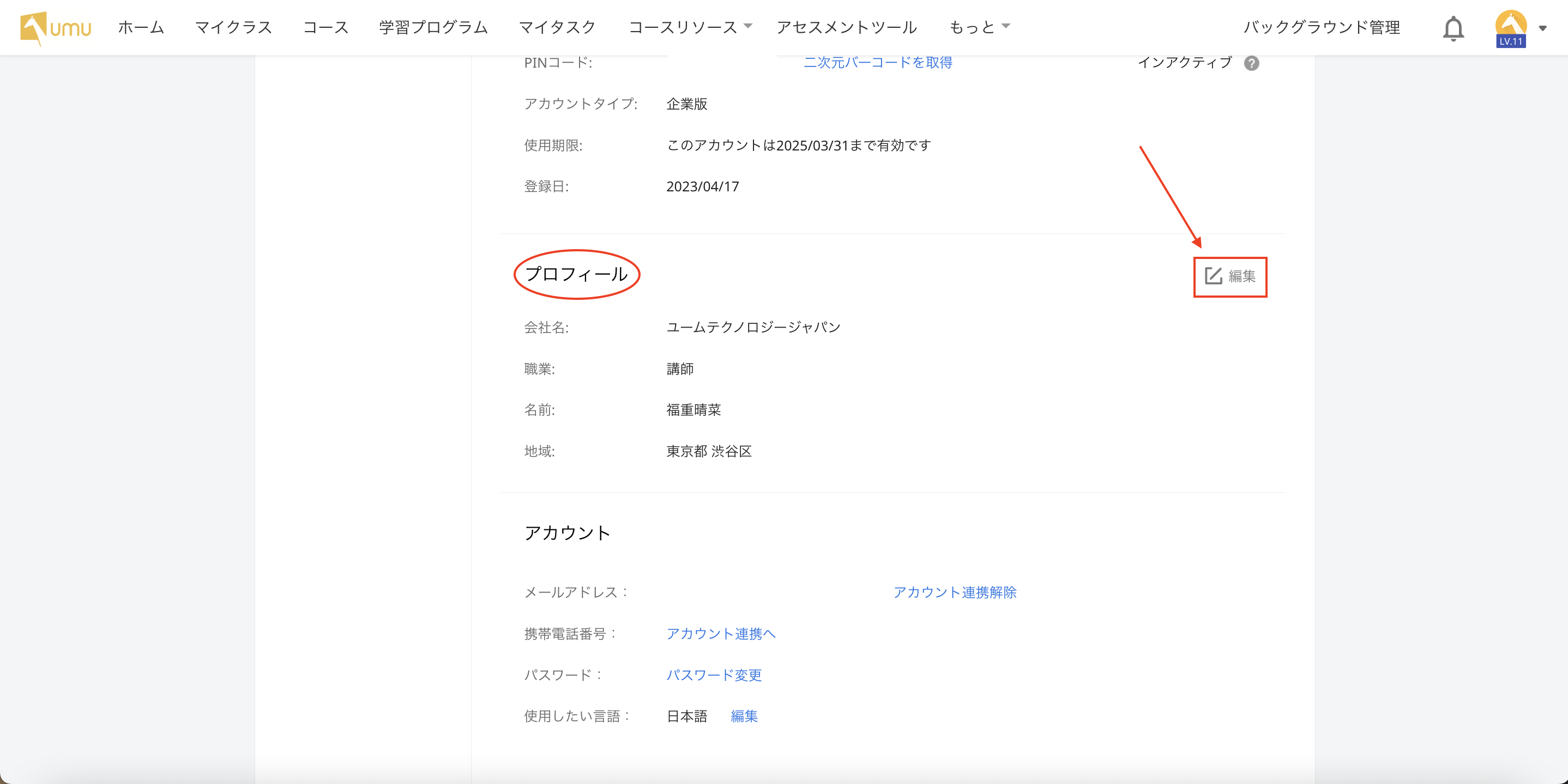 ② 下へスクロールし「プロフィール」欄の「編集」をクリック