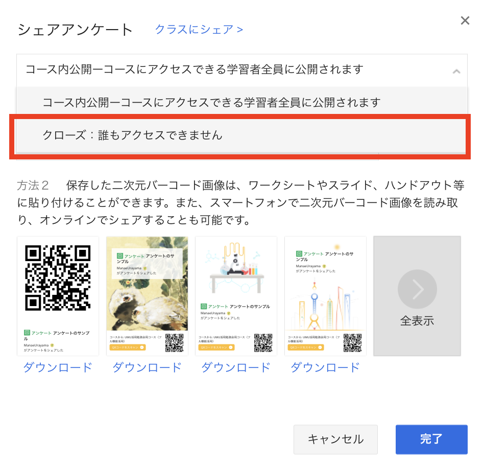 ②シェア設定→「クローズ:誰もアクセスできません」を選択し、右下の「完了」ボタンをクリック