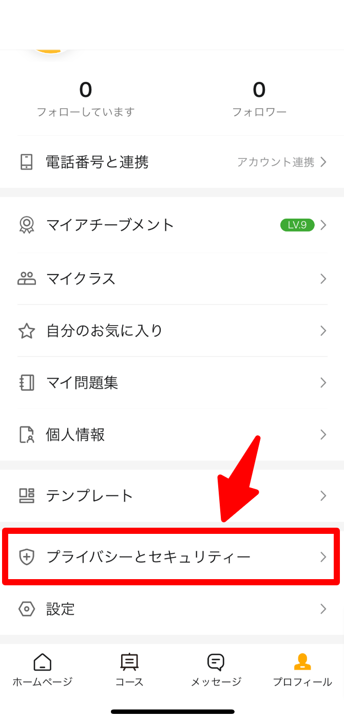②プロフィール画面の下部にある「プライバシーとセキュリティ」を選択