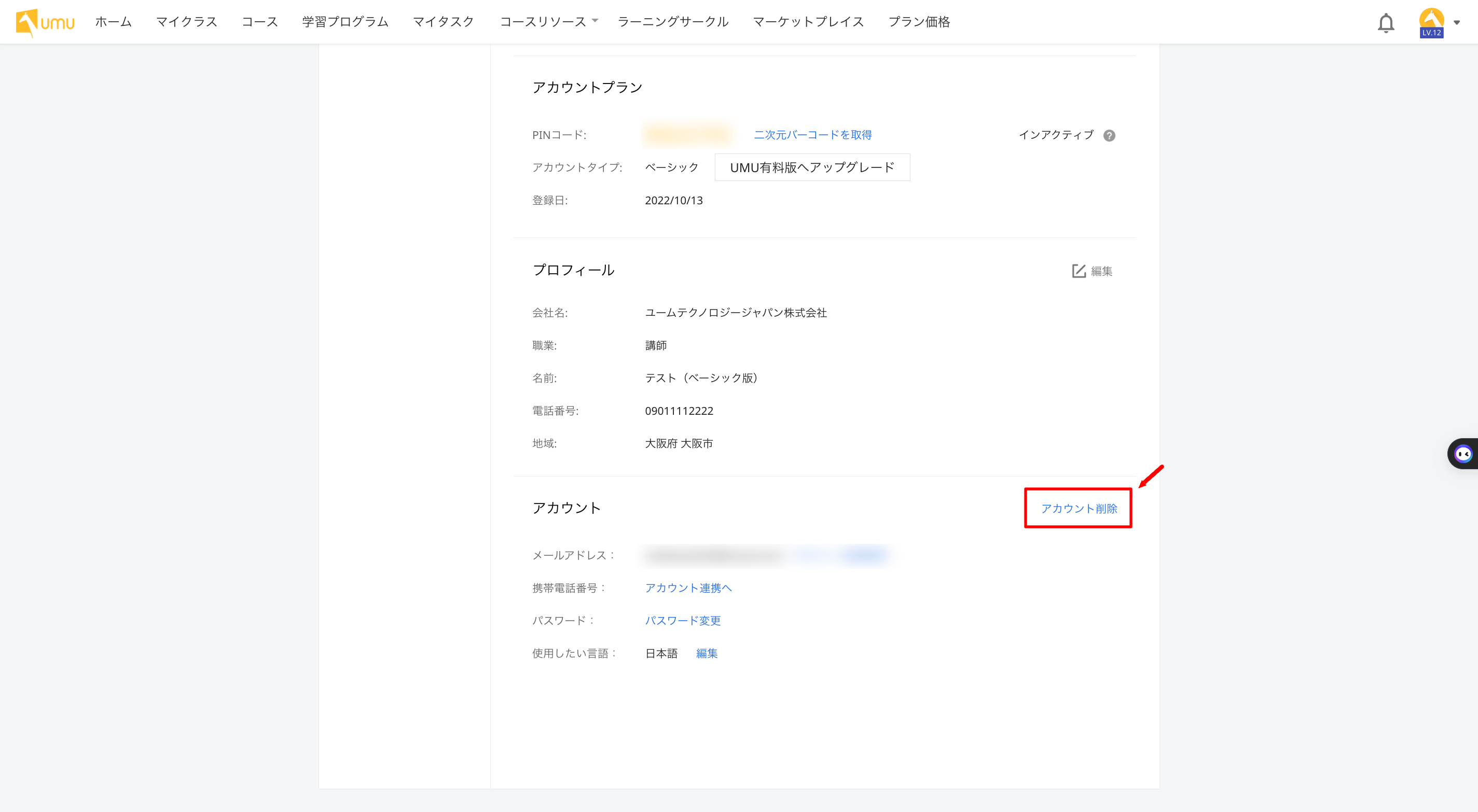 「UMUトップ画面」→「プロフィール」→「プライバシーとセキュリティー」→「アカウントを抹消します」からお手続きください。