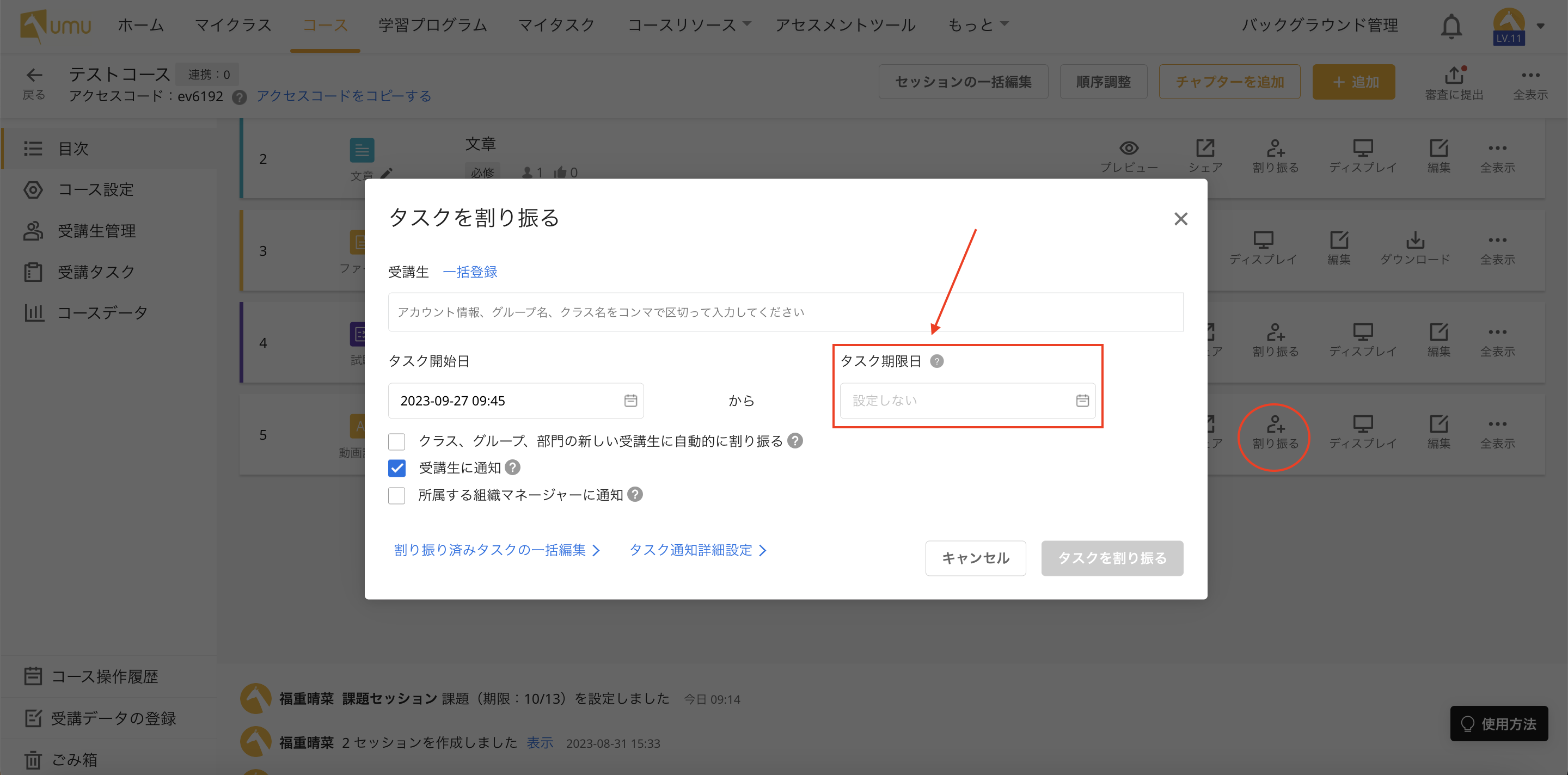 割り振ったAI課題のタスク期限が過ぎていた場合、受講生は課題を提出することができますか? A. タスク期限が過ぎていた場合でも、受講生は課題提出及びセッションにアクセスすることが可能です。 管理者様が以下の箇所より、タスク期限を設定し、期限を過ぎた場合でも受講生は課題を提出することができます。 # 課題 # 受講タスク # 割り振り # FAQ # AIエクササイズ # よくある質問 Facebook SHARE Twitter SHARE LINE 送る Hatena BOOKMARK