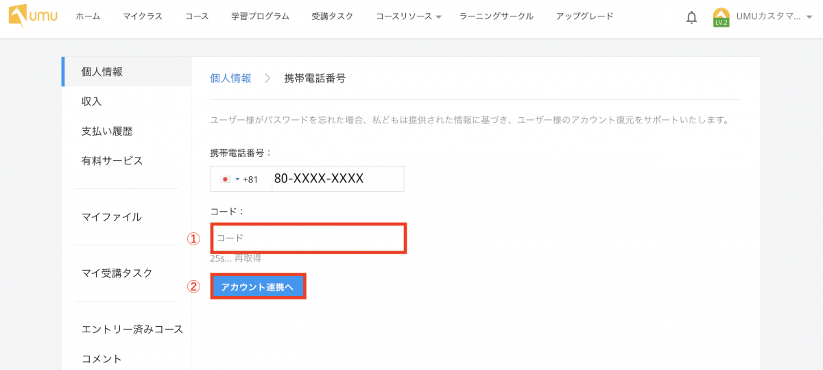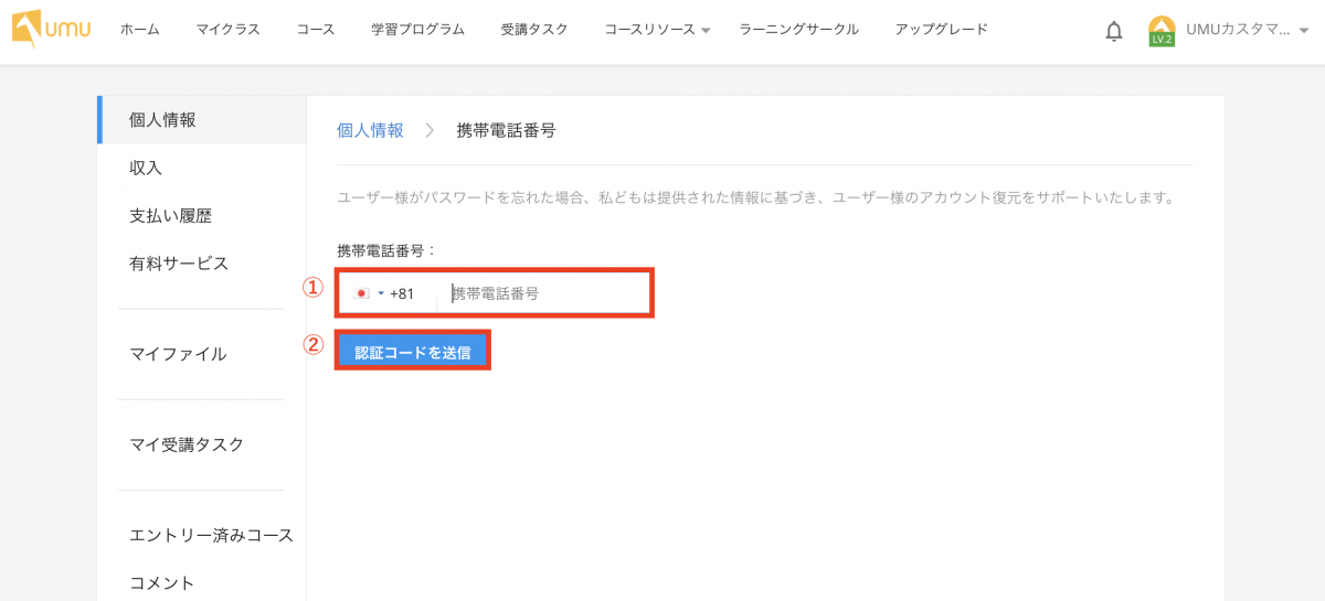 ④入力した番号宛に、UMUより6桁の認証コードがSMSにて配信されます。