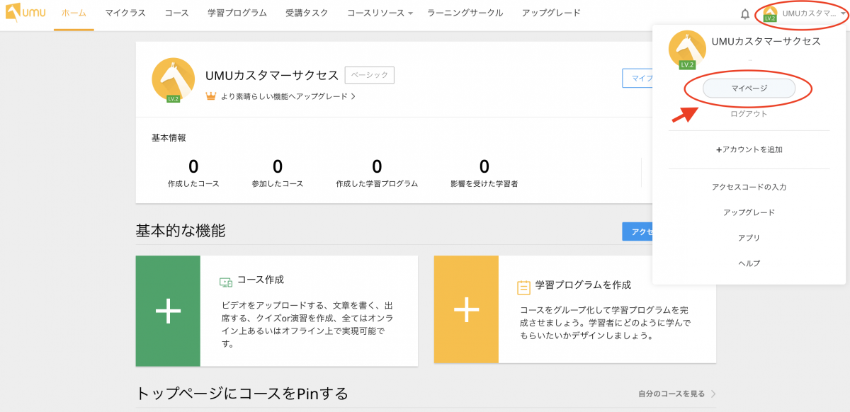 ①画面右上のアイコンにカーソルを当て、「マイページ」を選択