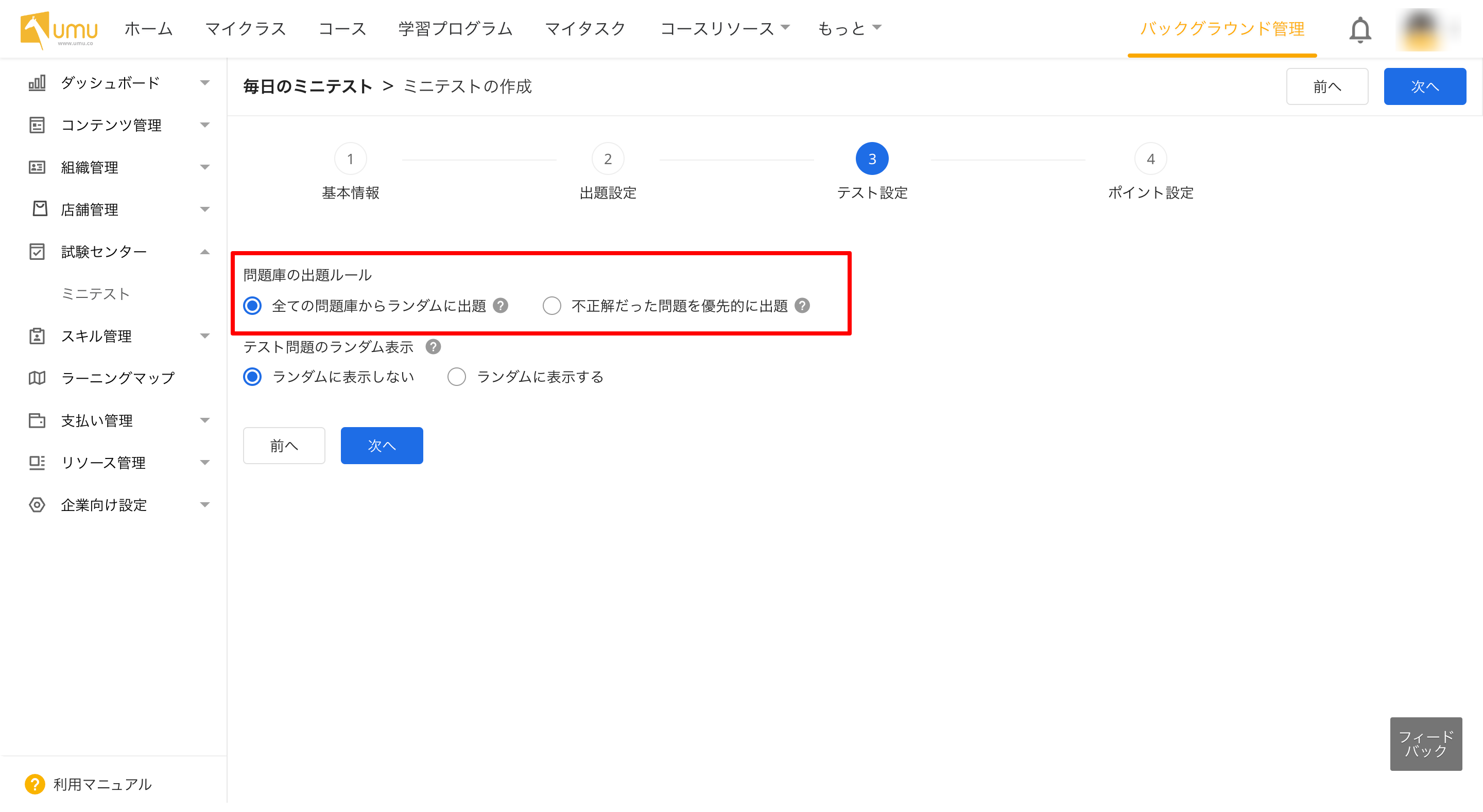 システムが不正解だった問題を優先的に抽出して、出題ルールに合わせてテストを作成します。