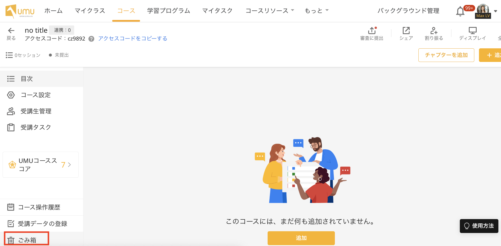 「ゴミ箱」は、コース、セッション作成ページにそれぞれございます。