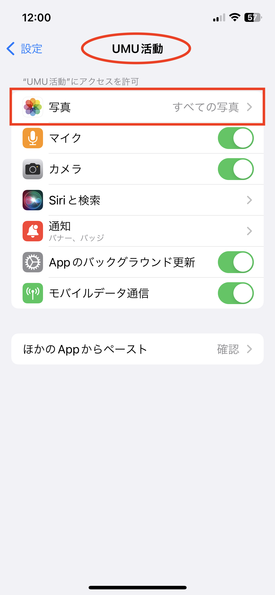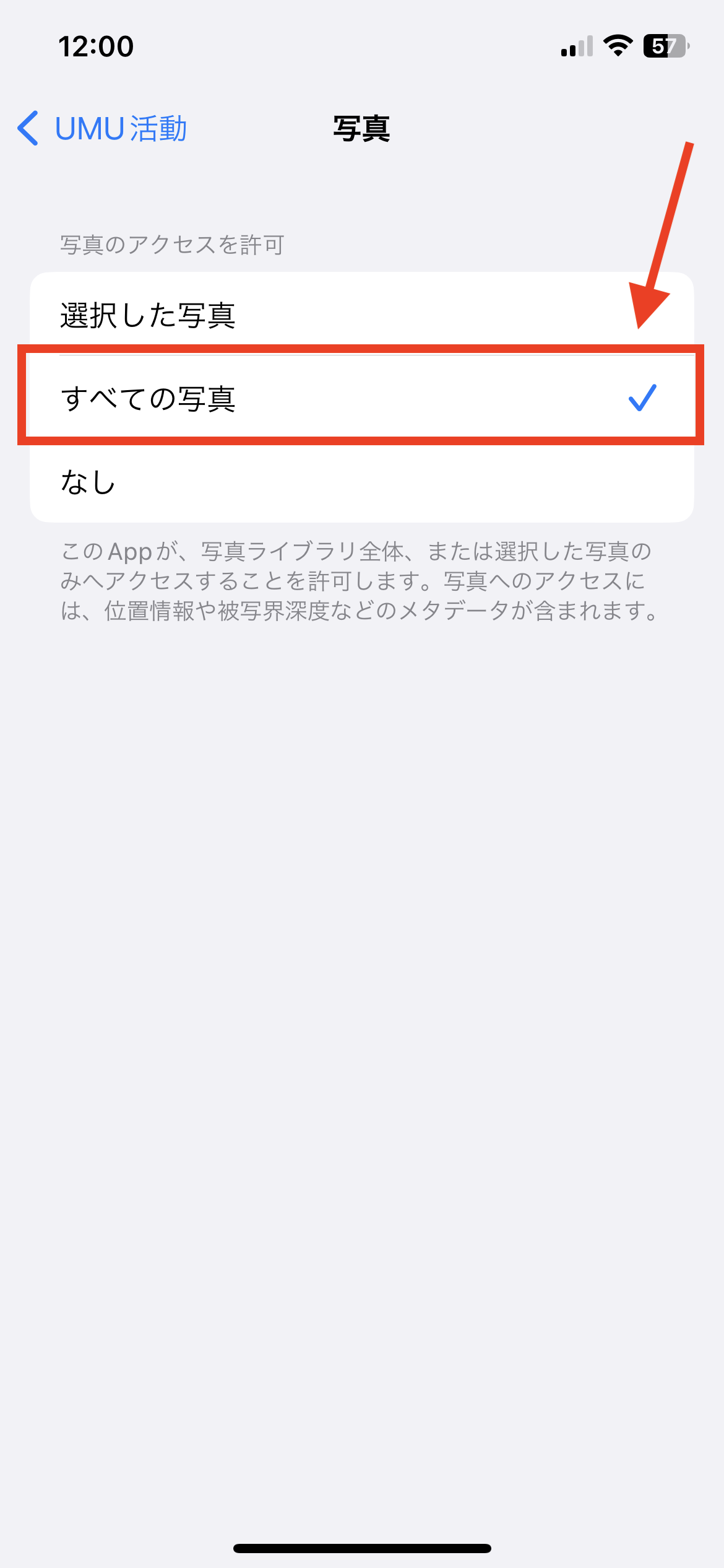 A. 「iPhone設定」で「UMUアプリの写真へのアクセス許可が一部に制限されている」可能性がございます。