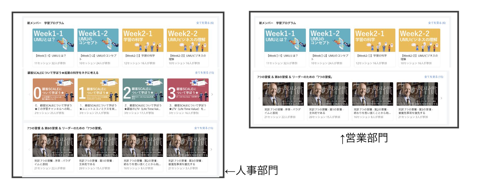 同じプラットフォームでも、例えば人事部門営業部門が見える「ホーム」ページを全く異なるページの設定が可能です。