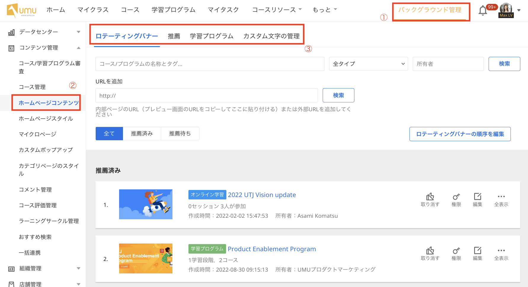 ホームページコンテンツの[ロテーティングバナー/推薦/学習プログラム/カスタム文字]から該当のコンテンツを選択します。
