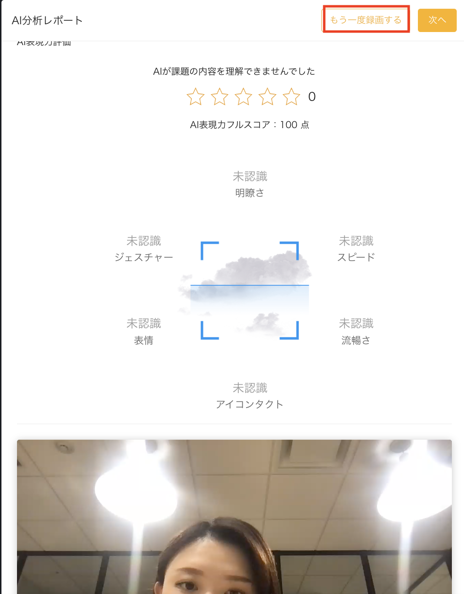 動画課題を提出する際、撮影後に「次へ」を押さずに、「もう一度録画」ボタンを選択し再撮影すると、撮影回数がカウントされます。