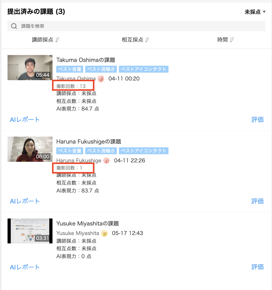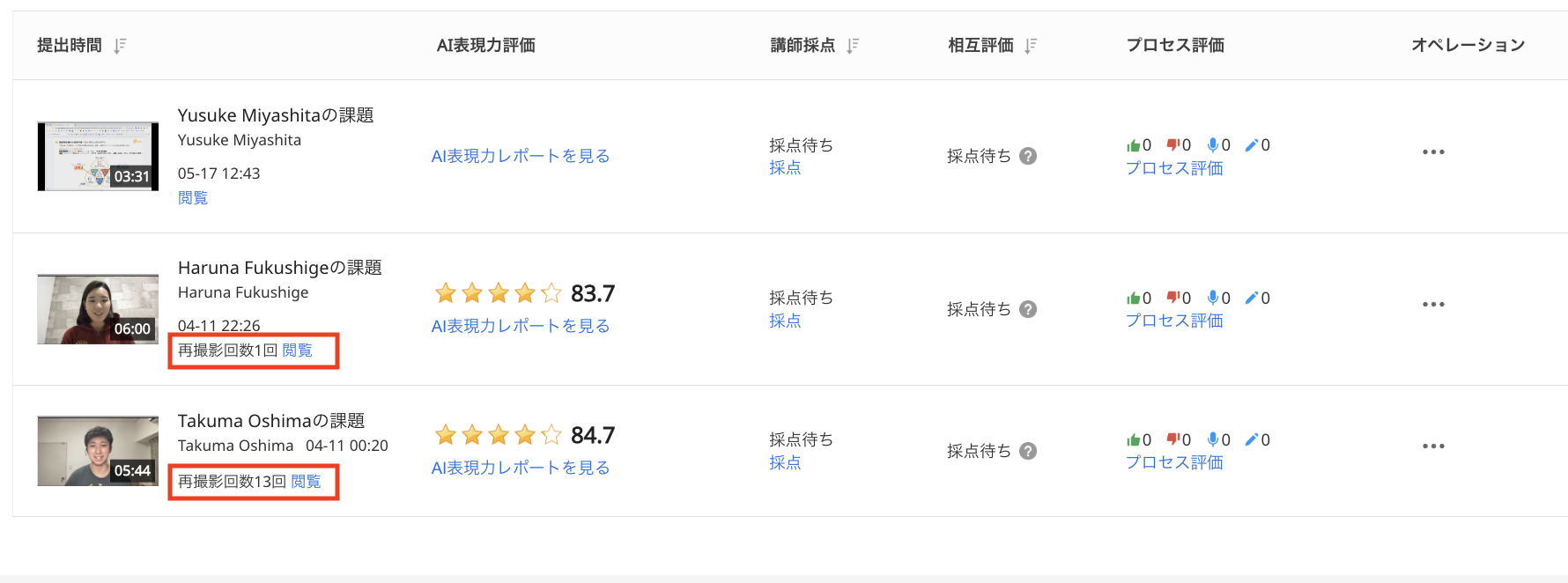 コース作成者もしくは連携者は、提出一覧画面からも再撮影回数を確認いただくことができます。