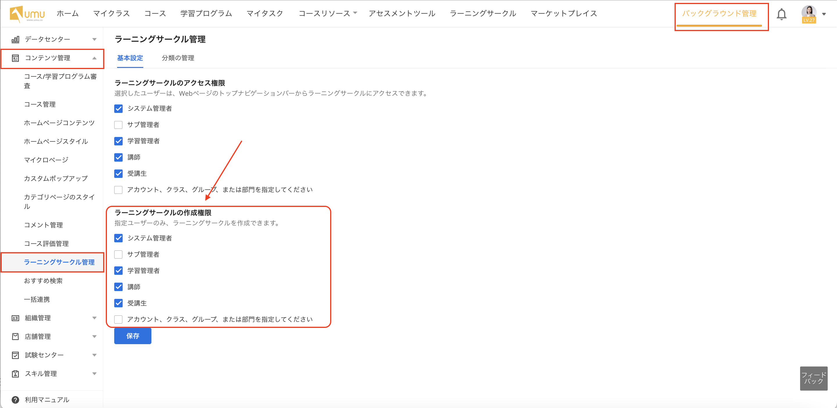 管理者/ゲスト講師に関しましては、ラーニングサークル管理の設定に関係なく