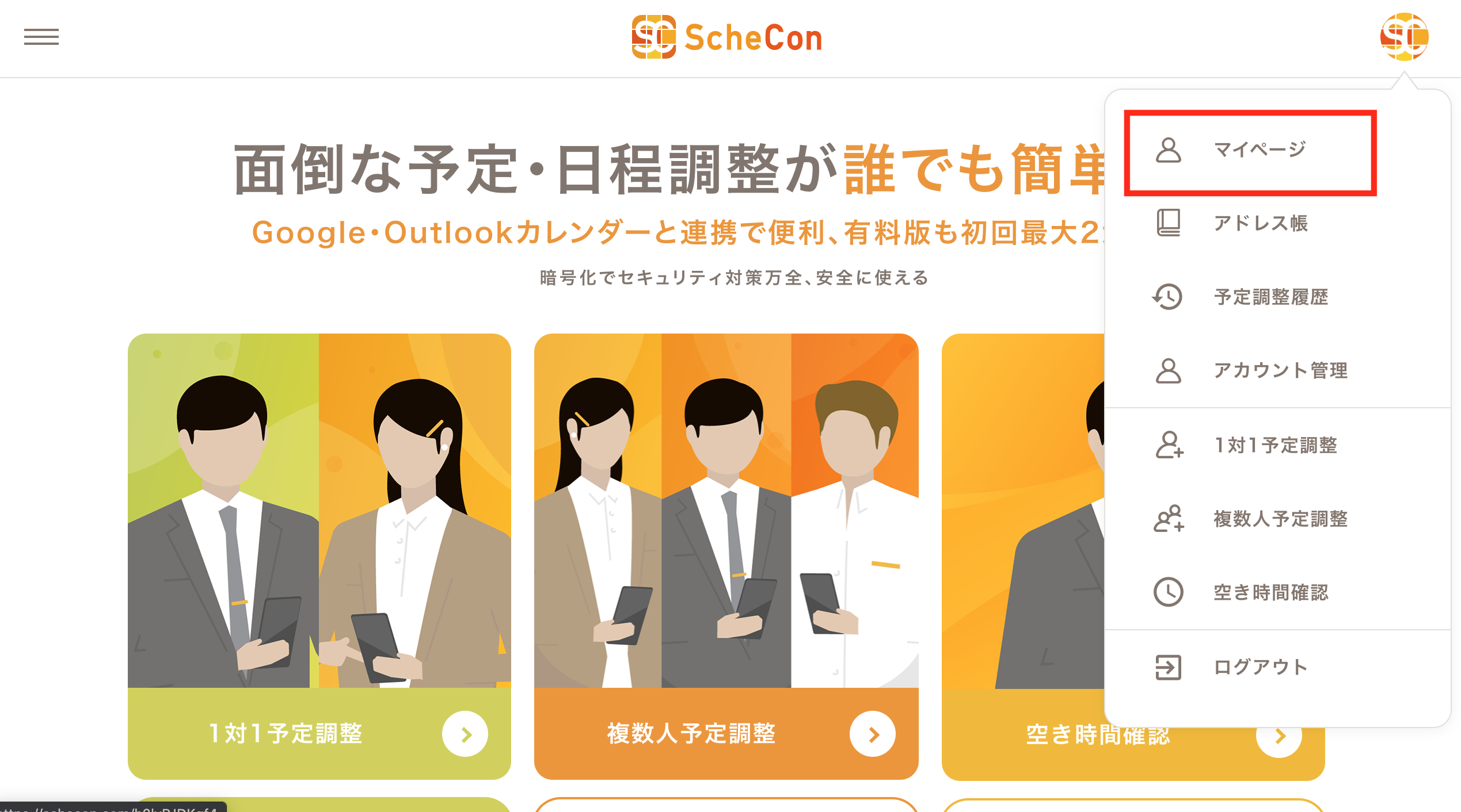 ホーム画面右プルダウンメニューから、「マイページ」を選択します。