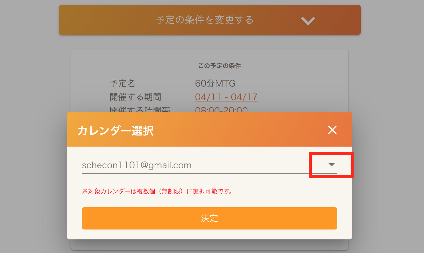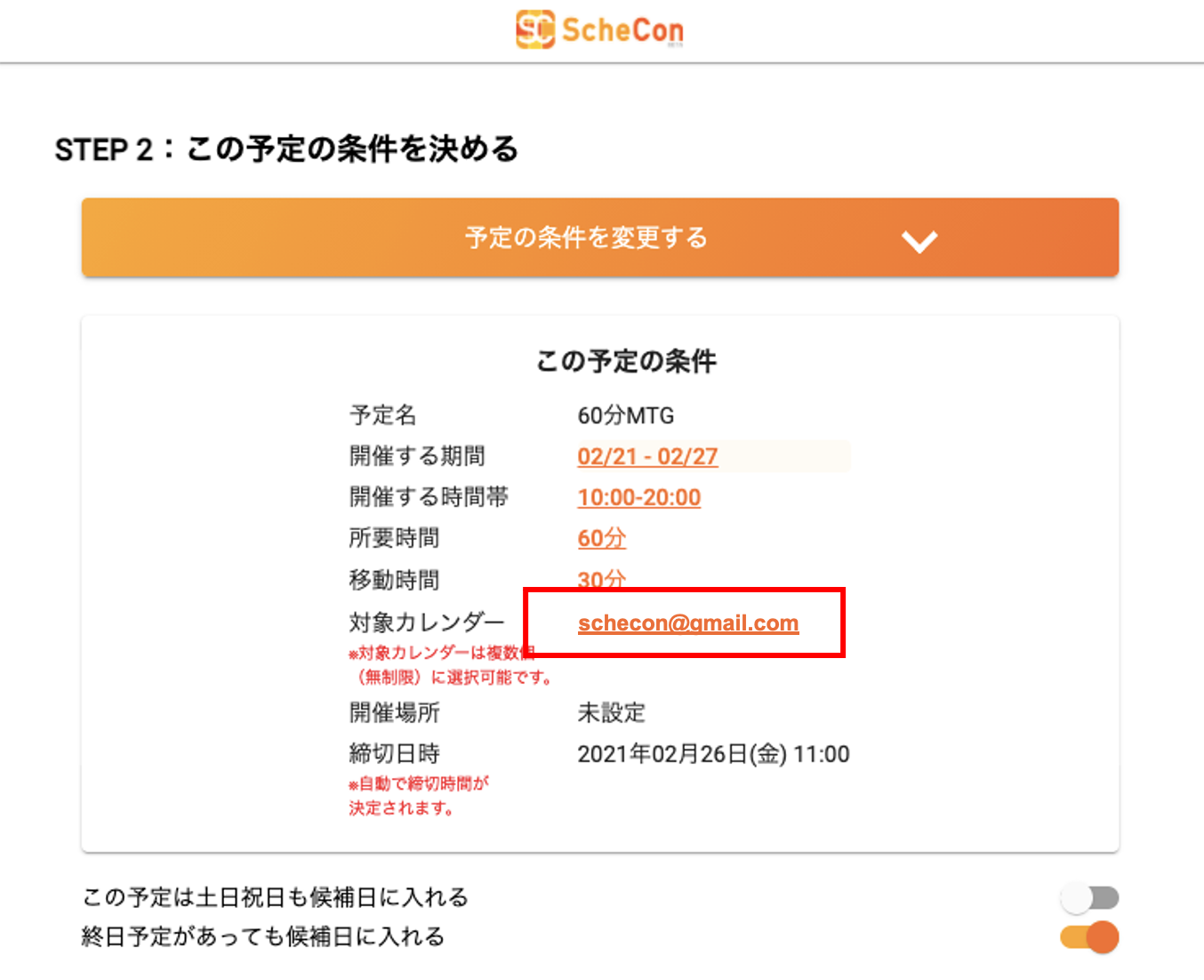 予定調整作成画面『STEP2』の「対象カレンダー」右のメールアドレスをクリックします。
