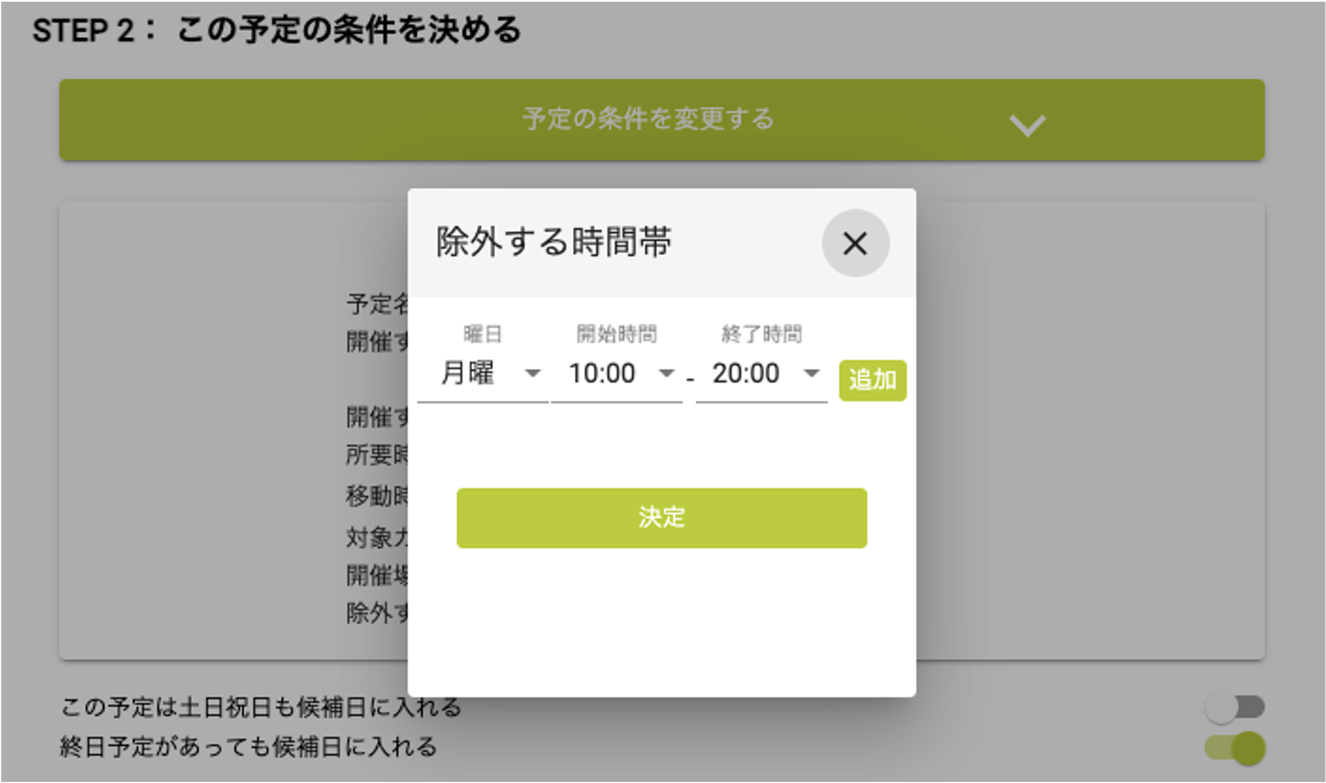 ポップアップより、除外する時間帯の「曜日」「開始時間」「終了時間」を選択し、「追加」ボタンをクリックします。除外する時間帯は複数登録可能です。