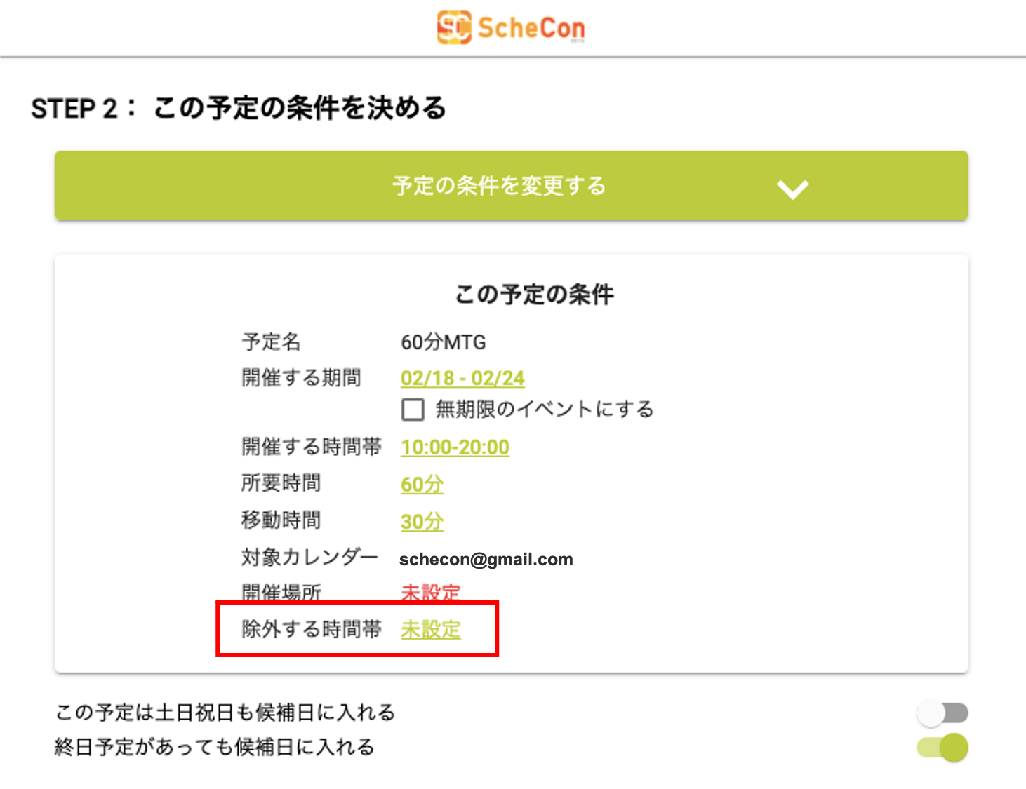 予定調整作成画面『STEP2』下部の「除外する時間帯」右の「未設定」をクリックします。