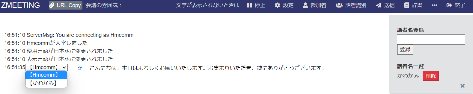 4.音声認識が行われたら音声認識結果の発言者欄の横のアイコンを押下し、手順3.にて登録した発話者を当てはめる