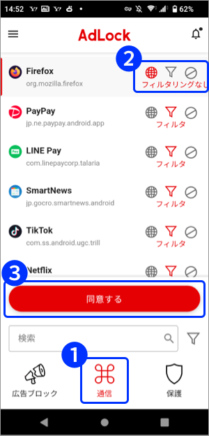 AdLock 画面下部の「通信」をタップする(以下の画像の①)。