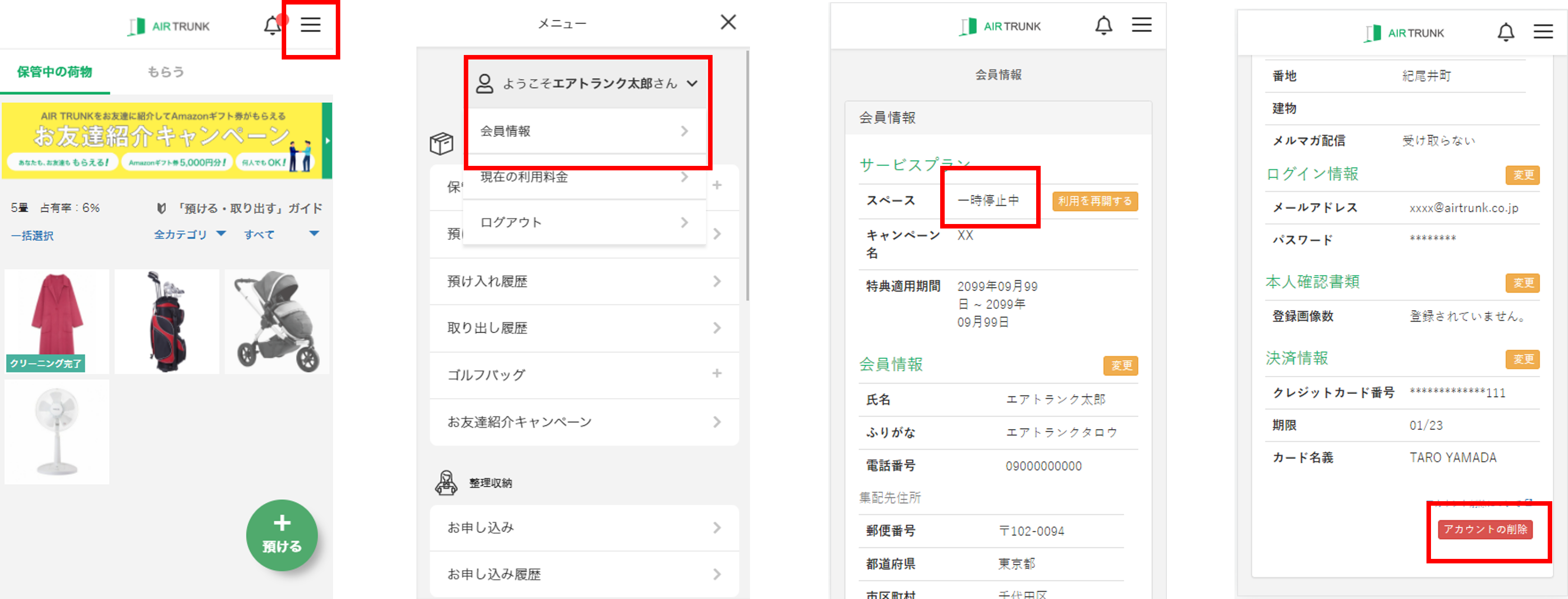 サービスの一時停止後、会員情報ページの最下部からアカウント削除することができます。