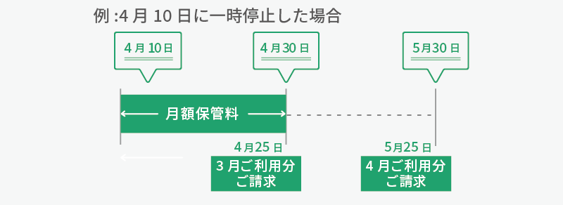 一時停止された場合、月額利用料金は一時停止月の末日までとなります。クレジットカードへのご請求はご利用月の翌月25日です(土日の場合翌営業日)。