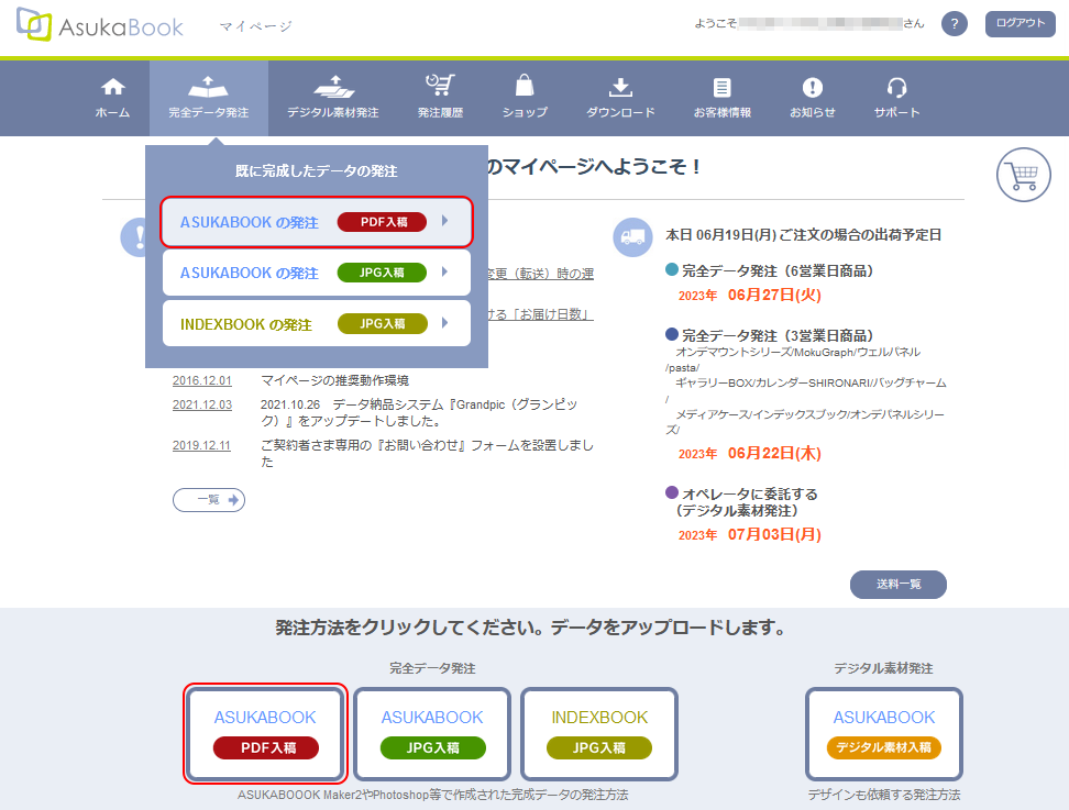 トップページより、完全データ発注>「ASUKABOOKの発注 PDF入稿」、もしくは「ASUKABOOK PDF入稿」ボタンをクリックします。