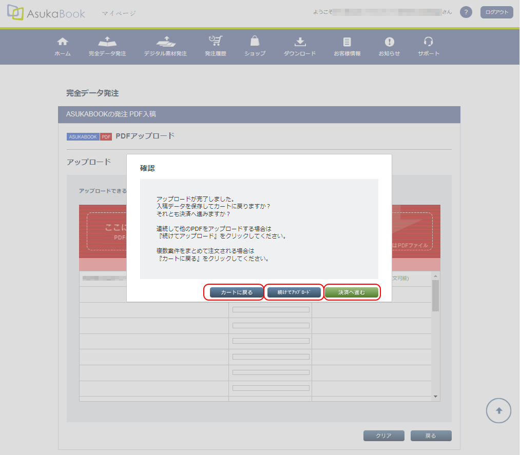 ・アップロードするPDFデータが複数ある場合は「続けてアップロード」をクリックしてください。
